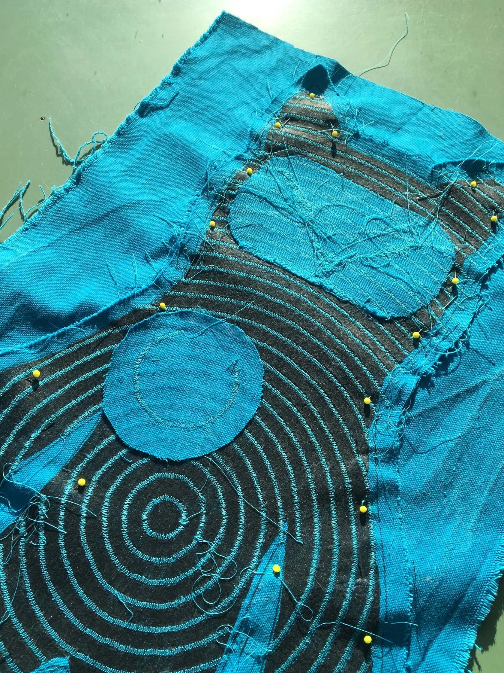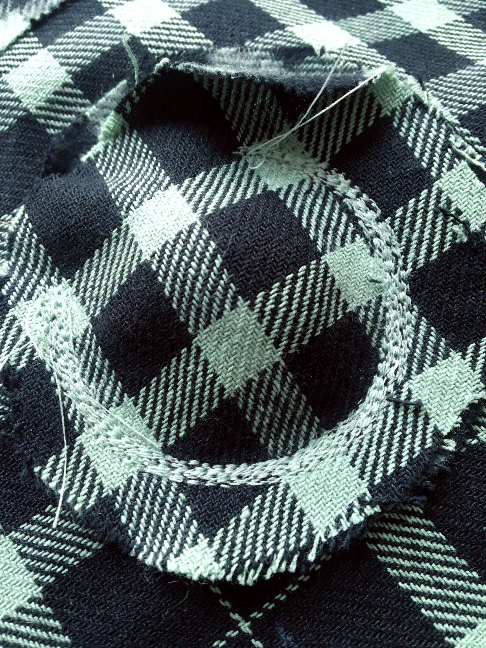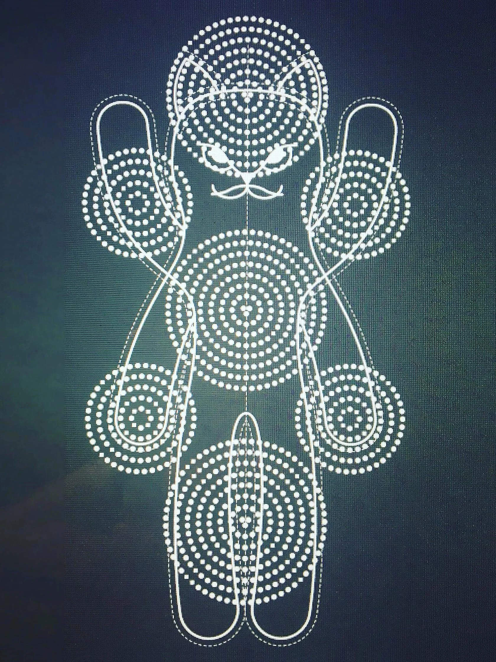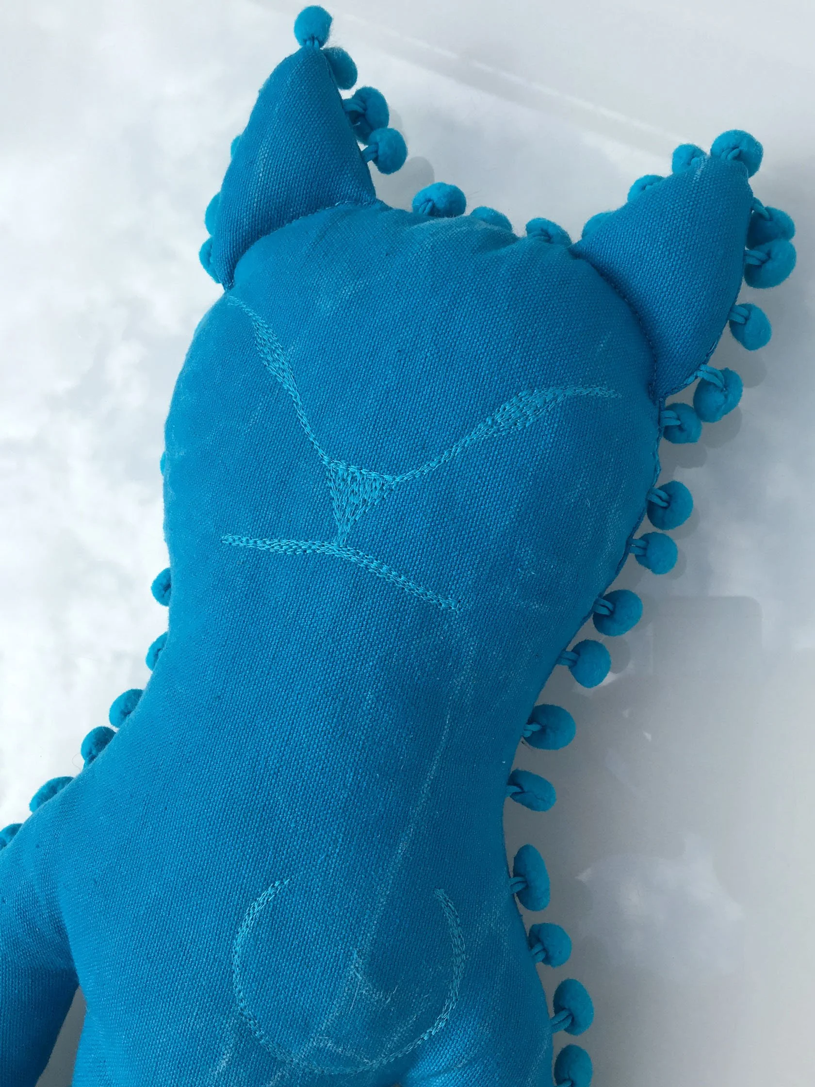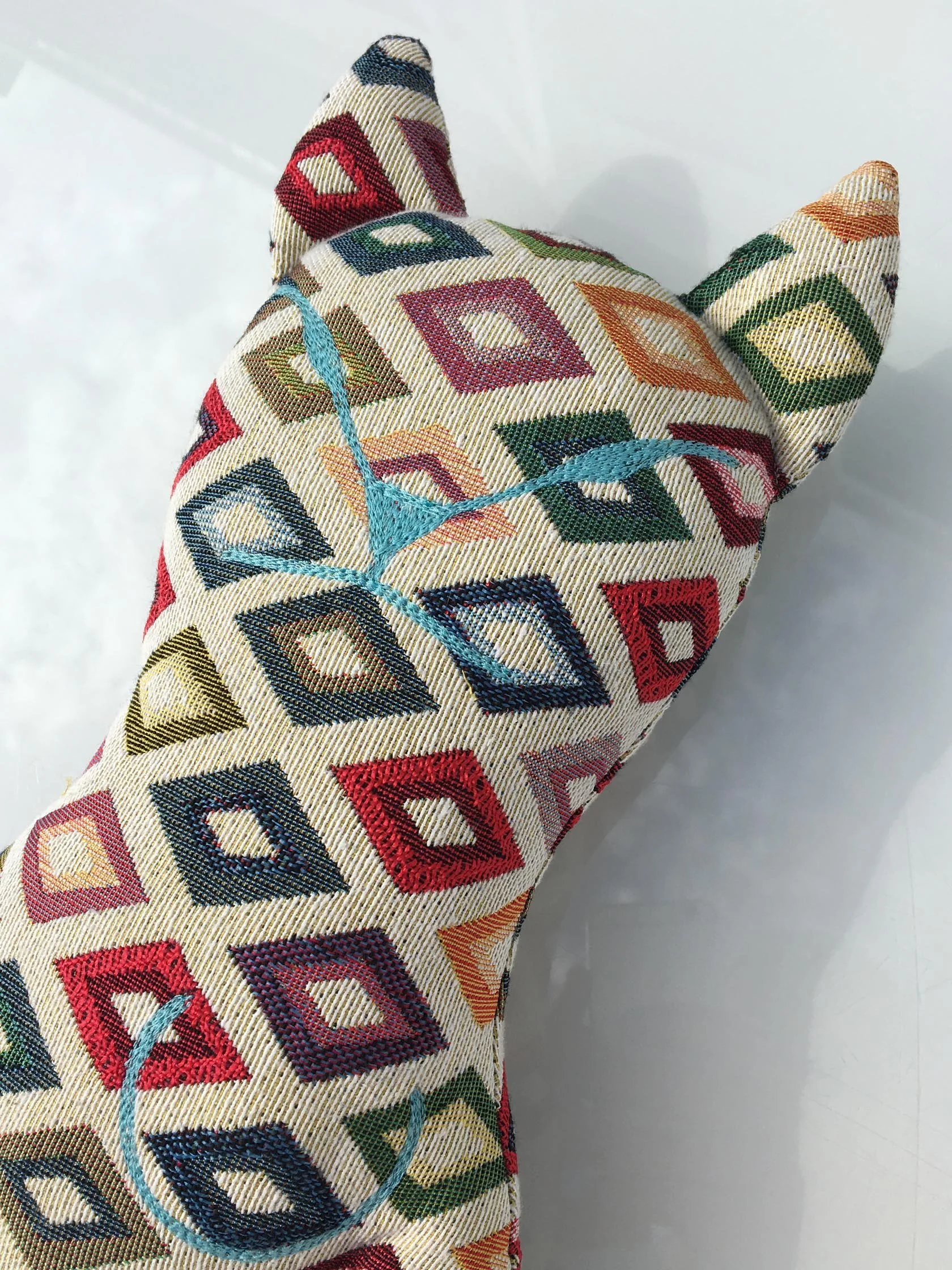 Some of the Shugonekos reveal their true beauty only in detail. Each face - and heart - is stitched onto the fabric using a sewing machine, but not with the help of a computerized sewing machine, rather to some extent by hand. Some of the embroidery designs are machine-stitched, but still hand-sewn onto the fabric. The circular patterns in the Ocean series and some of the Shugonekos in the Mexican series are sewn on using a combination of machine and hand-stitching in numerous steps.