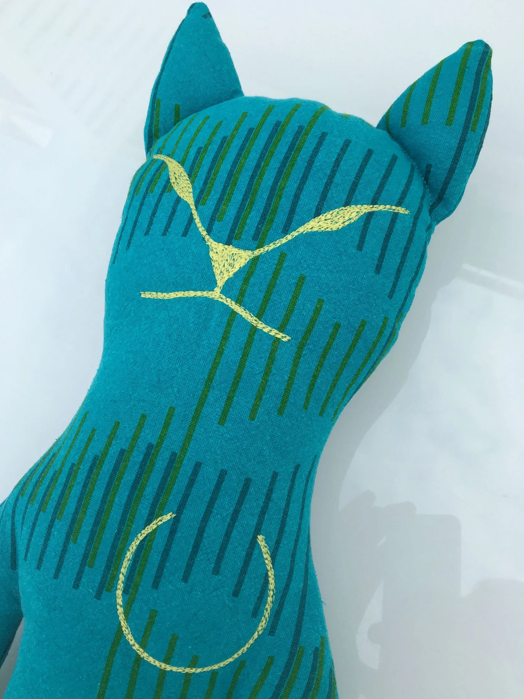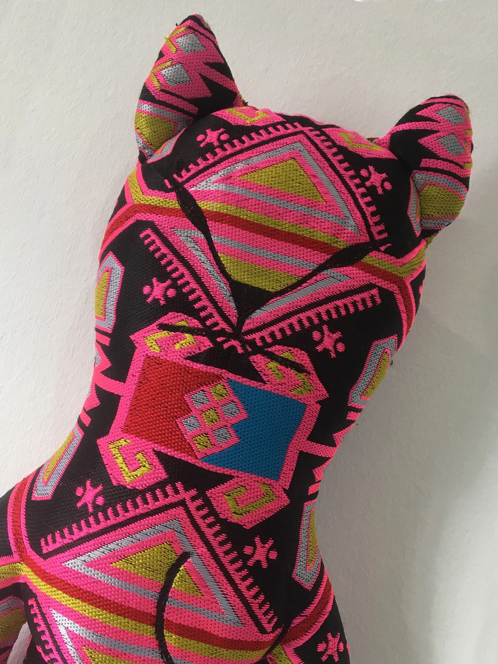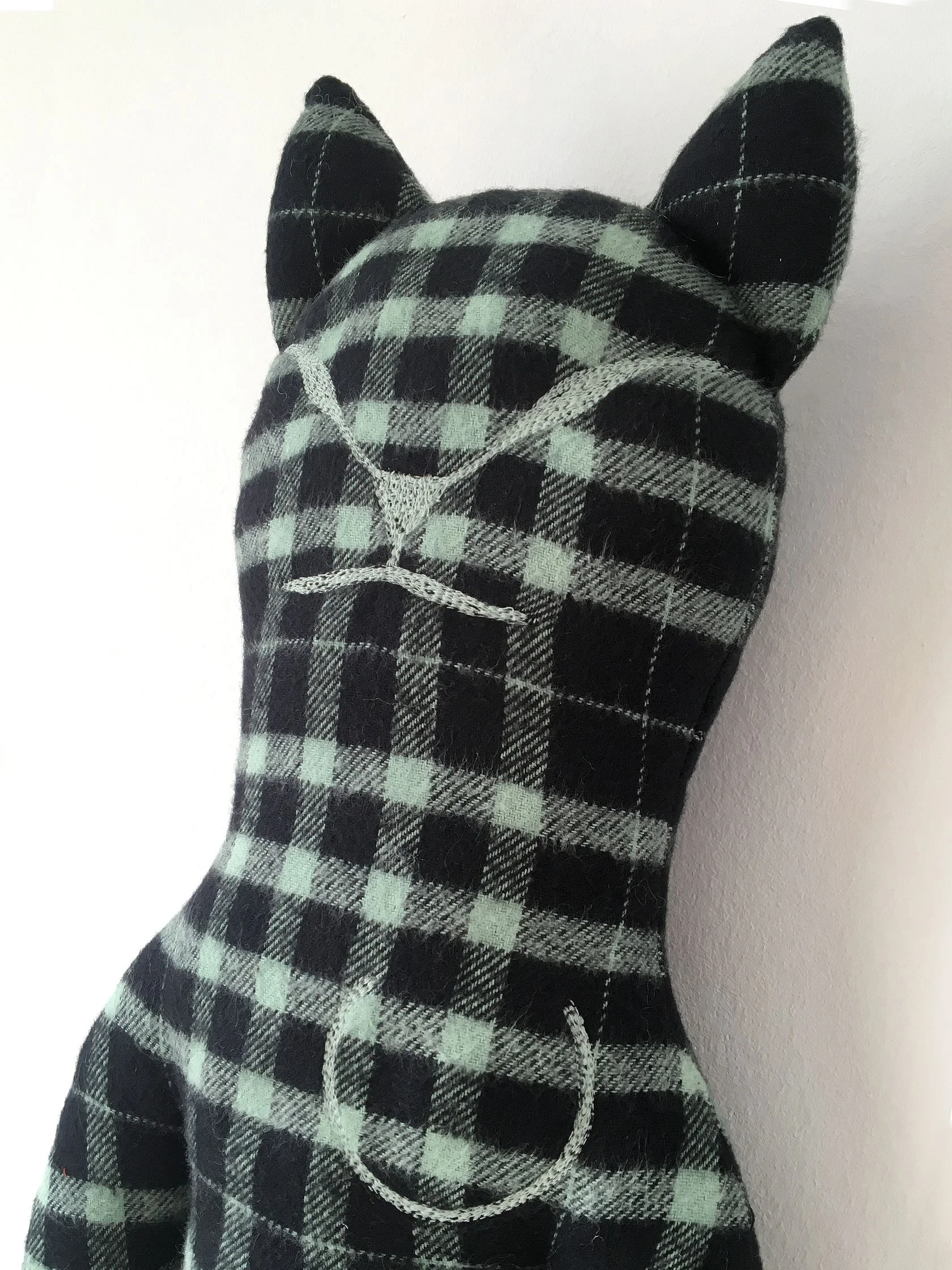Let me explain in a nutshell. Other than the lovely but somehow ubiquitous winking cats, which commonly are to invite prosperity and health, I envision my little art pieces more as a manifestation of a good house spirit, a totem, a talisman, a feline fabric charm.