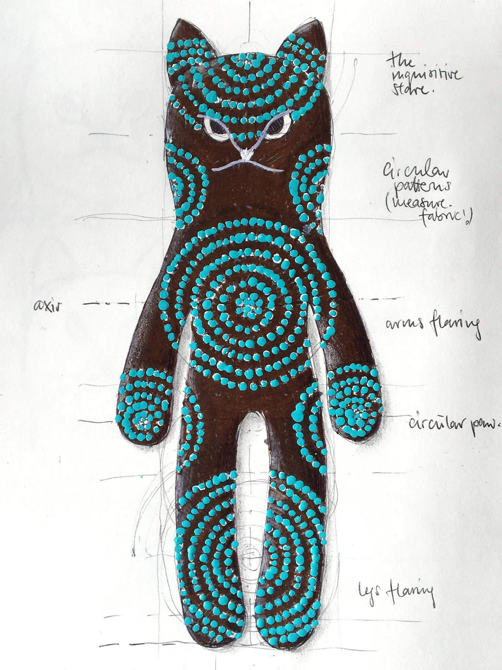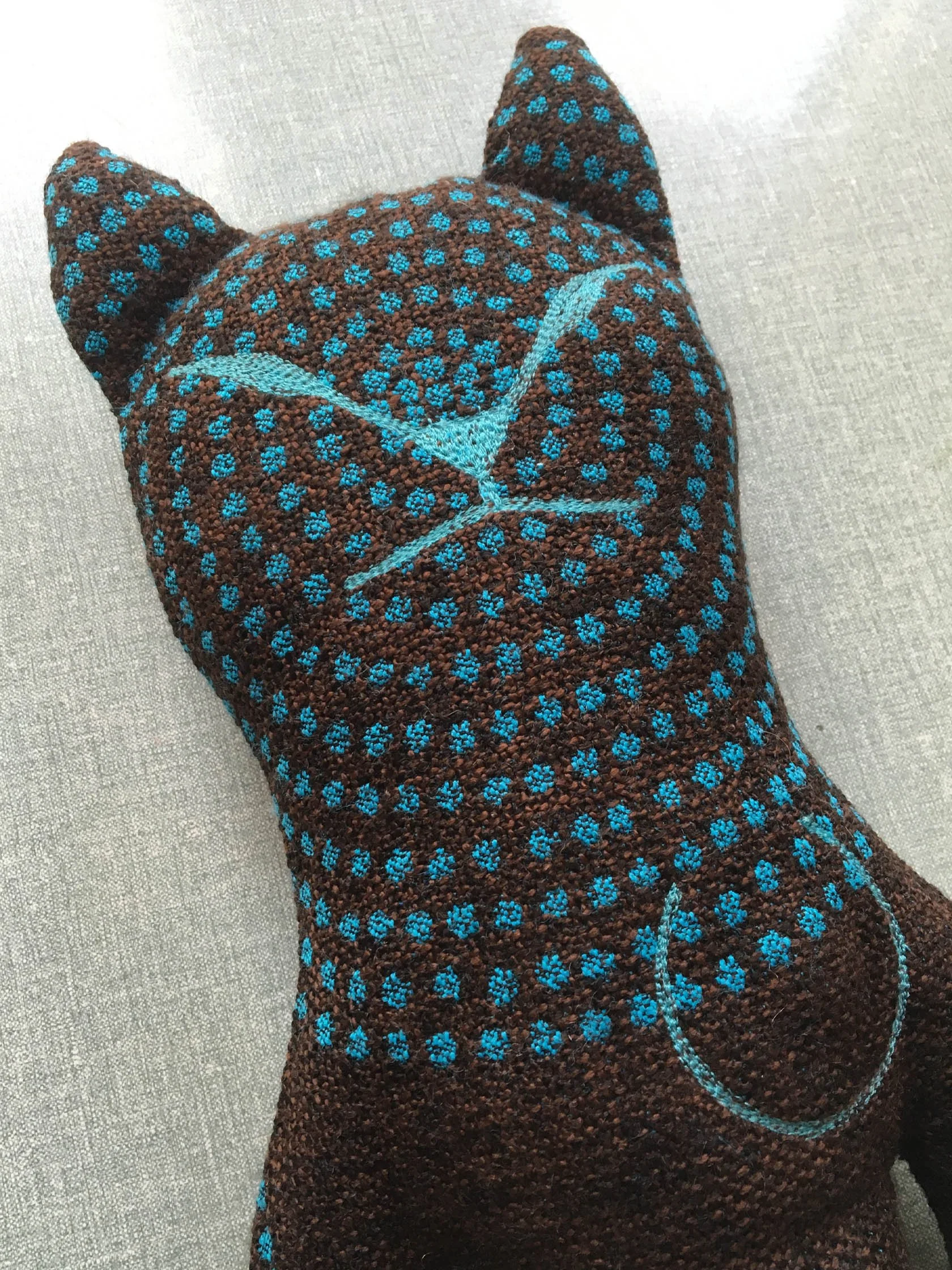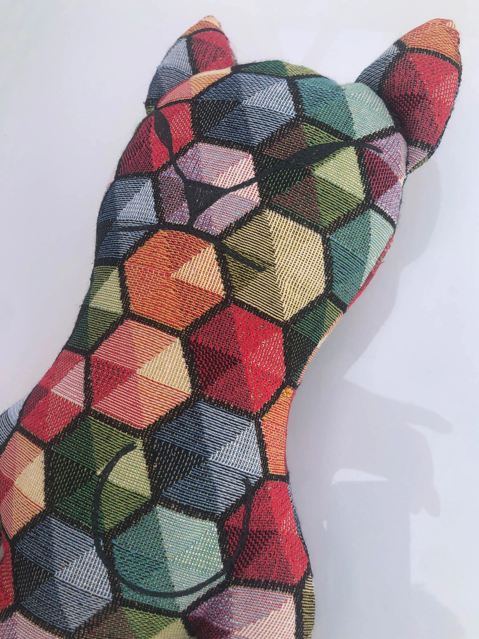 Let me explain in a nutshell. Other than the lovely but somehow ubiquitous winking cats, which commonly are to invite prosperity and health, I envision my little art pieces more as a manifestation of a good house spirit, a totem, a talisman, a feline fabric charm.
